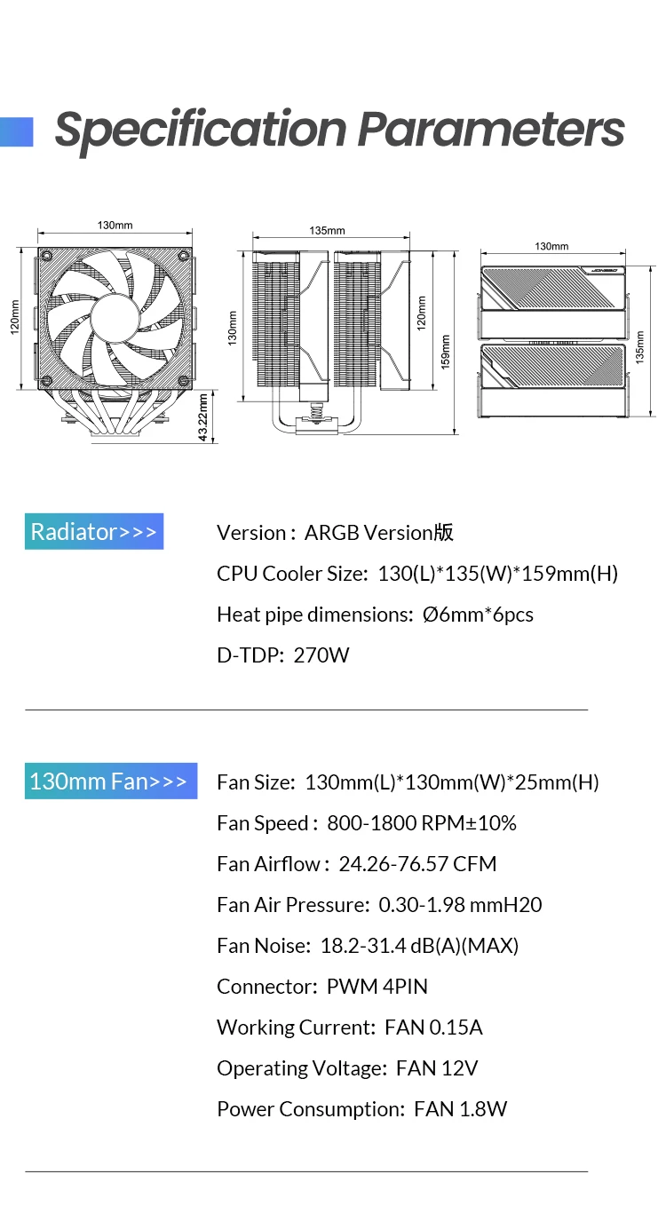 Power Consumption:Fan 1.8W(130mm Fan) Fan 3.12W LED 1.5W(120mm Fan) |