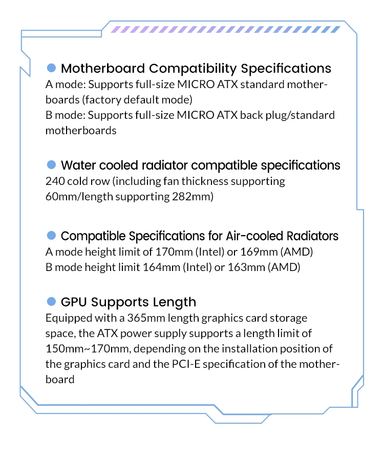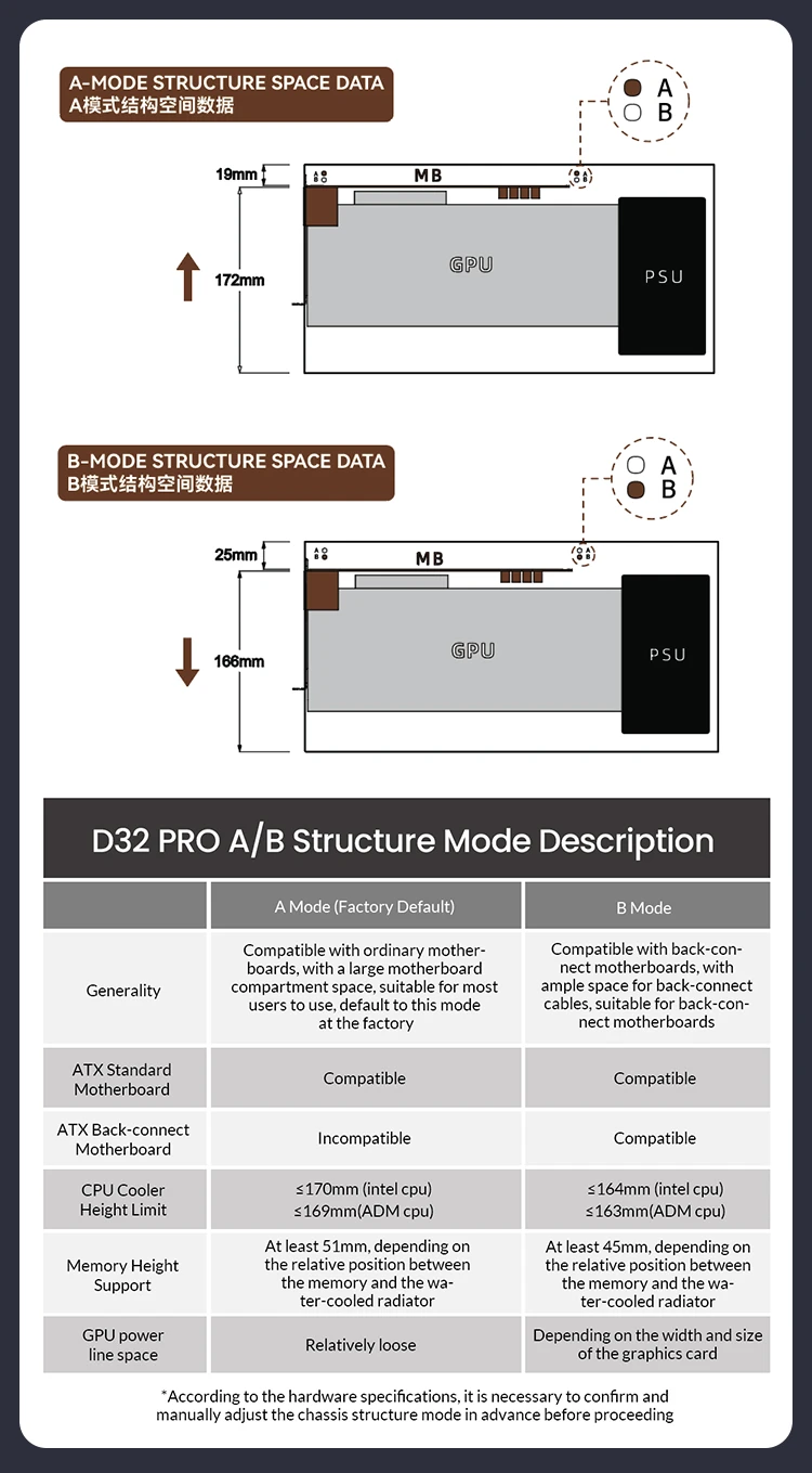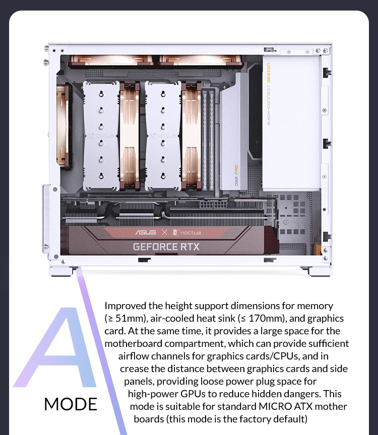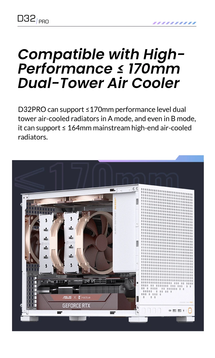 CPU Air Cooler Clearance:In A mode, the height limit is 170mm (Intel CPU) or 169mm (AMD CPU) |