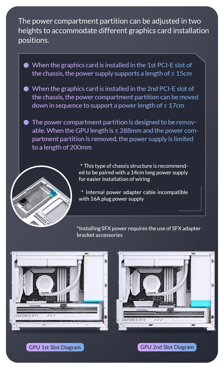 • When the GPU length is ≤288mm and the power compartment partition is removed, the power supply
