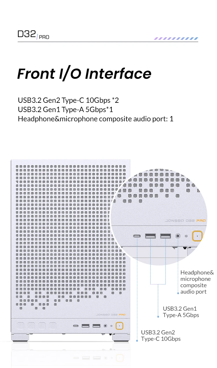 Front IO Port:USB3.2 Gen1 Type-A*2/USB3.2 Gen 2 Type-C*1/AUDIO*1 & MIC*1 |