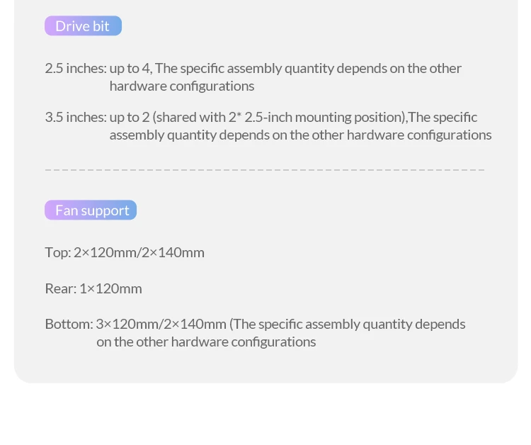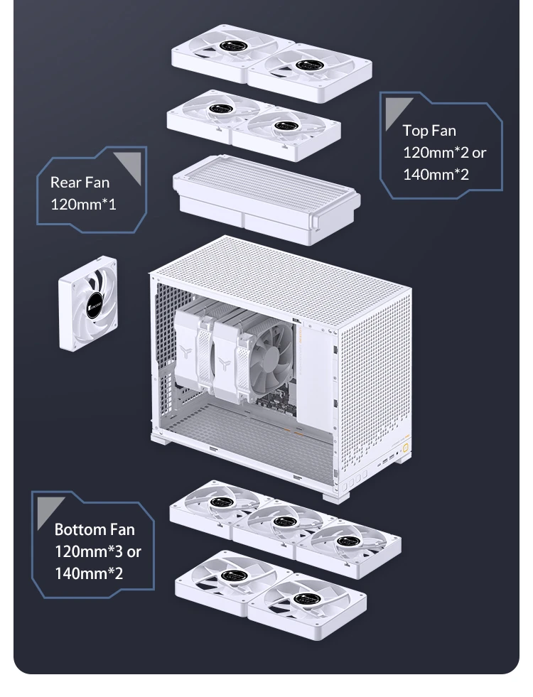 FAN:Top: 2 x 120mm / 2 x 140mm Rear: 1 x 120mm Bottom: 3 x 120mm / 2 x 140mm, depends on other hardware configurations |