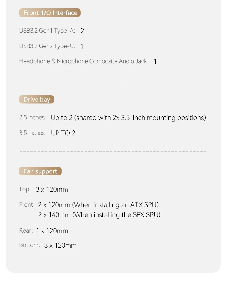 | Fab:Top:120mm*3(optional); Front:120mm*2(with ATX PSU)/ 140mm*2(with SFX PSU)(optional); Rear:120mm*1(optional); Bottom:120mm*3(optional) |