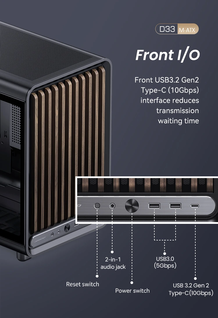 | Front I/O:USB3.2 Gen2 Type-C*1/USB3.0*2/AUDIO*1+MIC*1(2 in 1) |