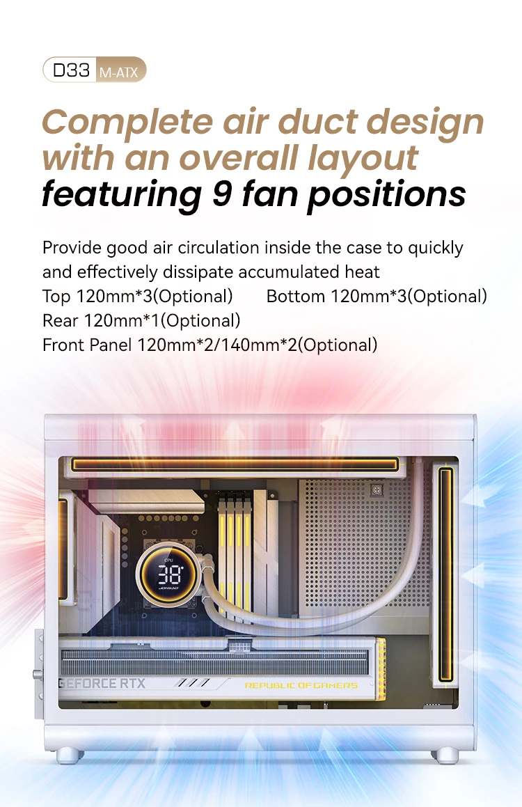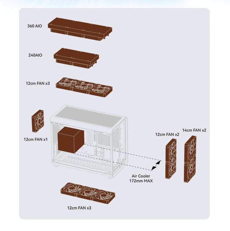 | Fab:Top:120mm*3(optional); Front:120mm*2(with ATX PSU)/ 140mm*2(with SFX PSU)(optional); Rear:120mm*1(optional); Bottom:120mm*3(optional) |