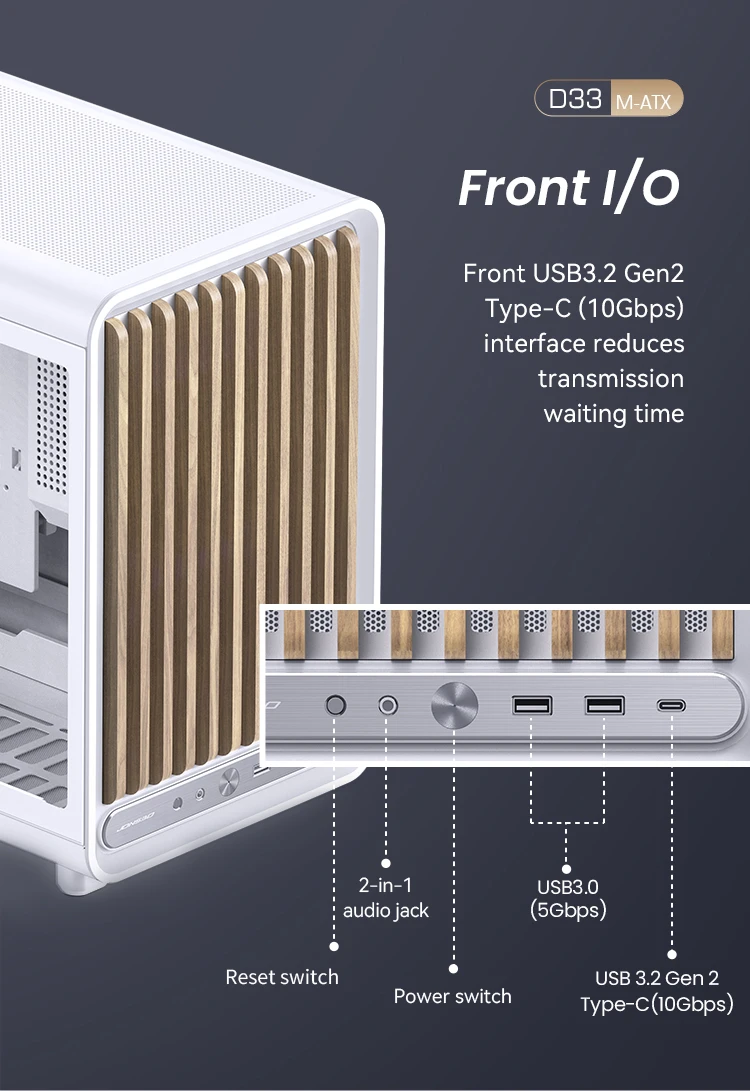 | Front I/O:USB3.2 Gen2 Type-C*1/USB3.0*2/AUDIO*1+MIC*1(2 in 1) |