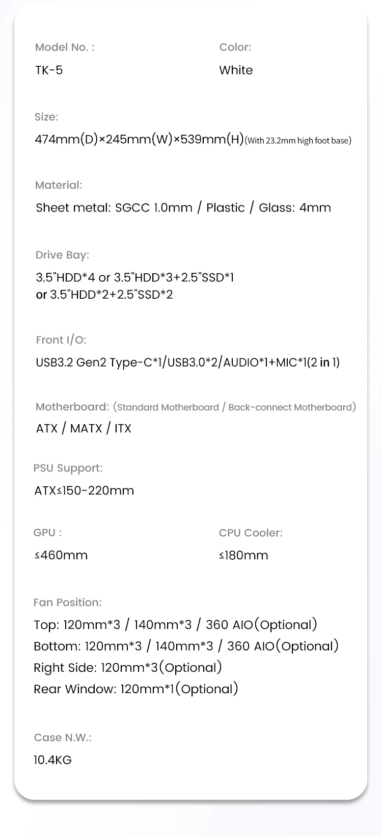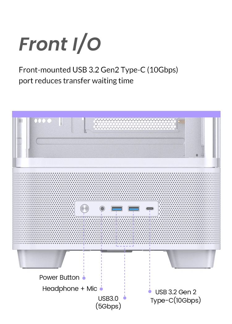 | Front IO Port: USB3.2 Gen2 Type-C*1 / USB3.0*2 / AUDIO*1+MIC*1(2 in 1) |