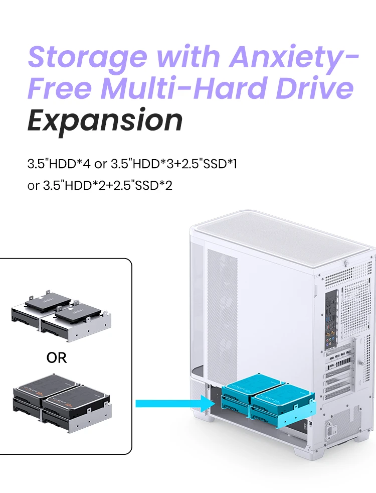 | Drive Bay:3.5"HDD*4 or 3.5"HDD*3+2.5"SSD*1 or 3.5"HDD*2+2.5"SSD*2 |