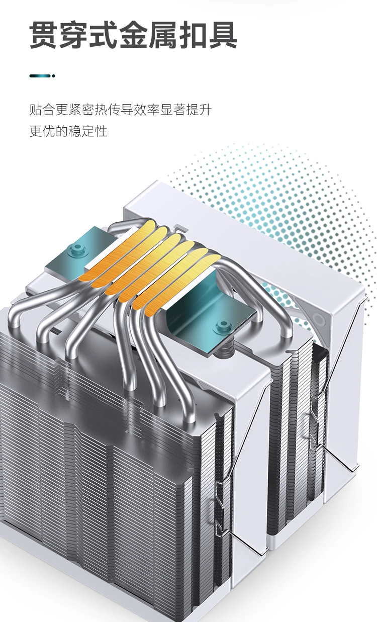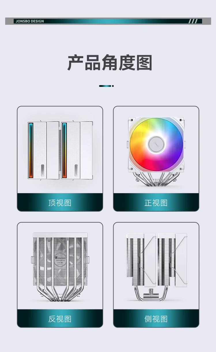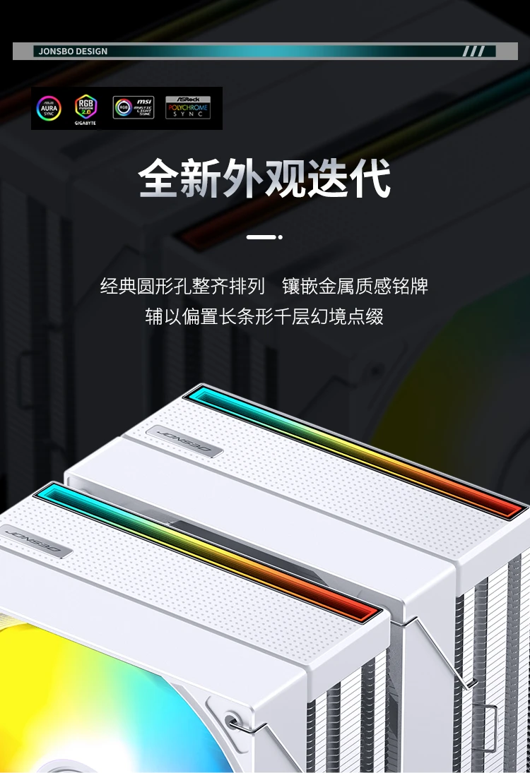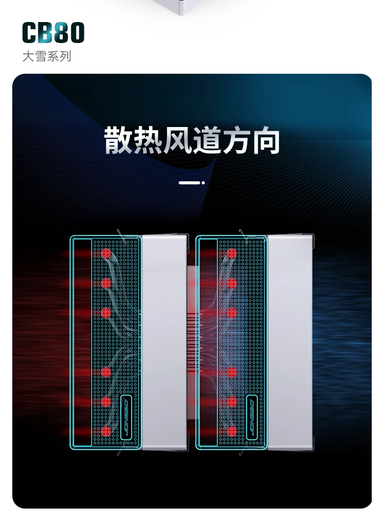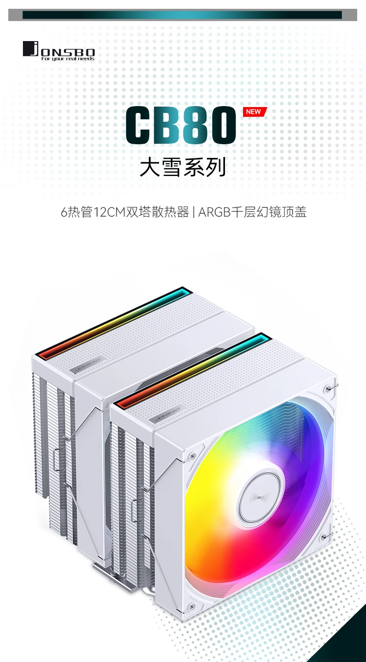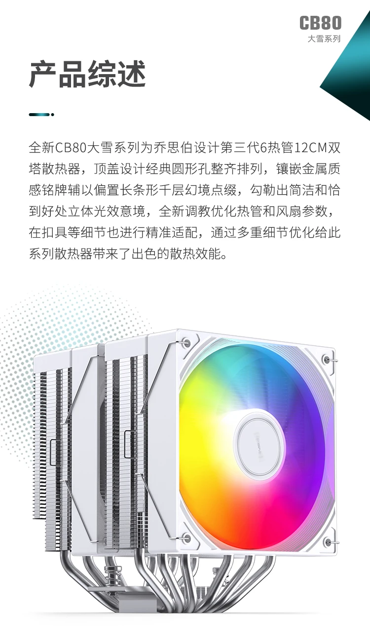 全新CB80大雪系列为乔思伯设计第三代6热管12CM双塔散热器,顶盖设计经典圆形孔整齐排列,镶嵌金属质感铭牌辅以偏置长条形千层幻境点缀,勾勒出简洁和恰到好处立体光效意境,全新调教优化热管和风扇参数,在扣具等细节也进行精准适配,通过多重细节优化给此系列散热器带来了出色的散热效能。