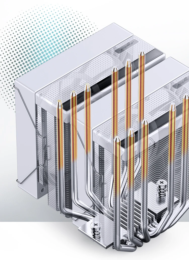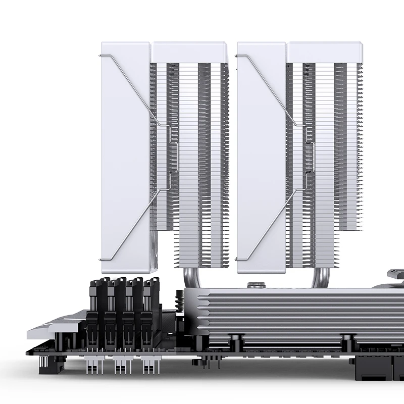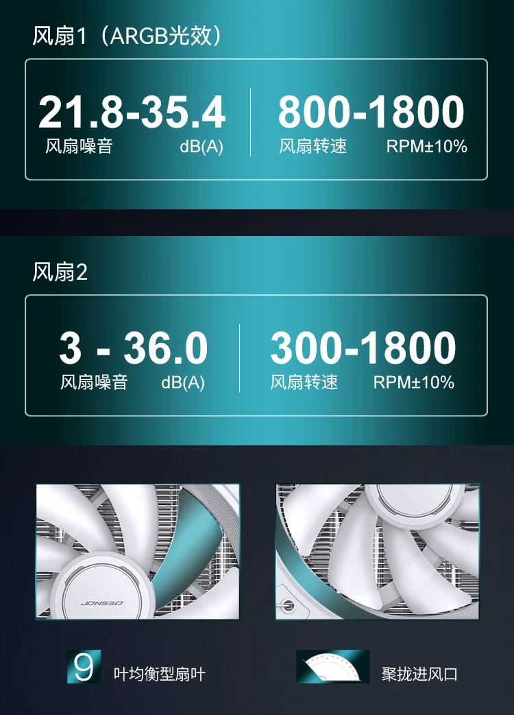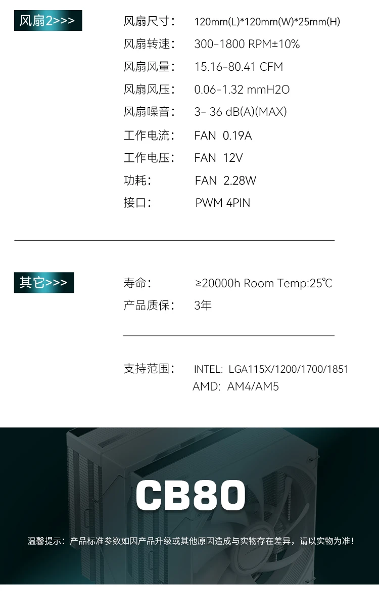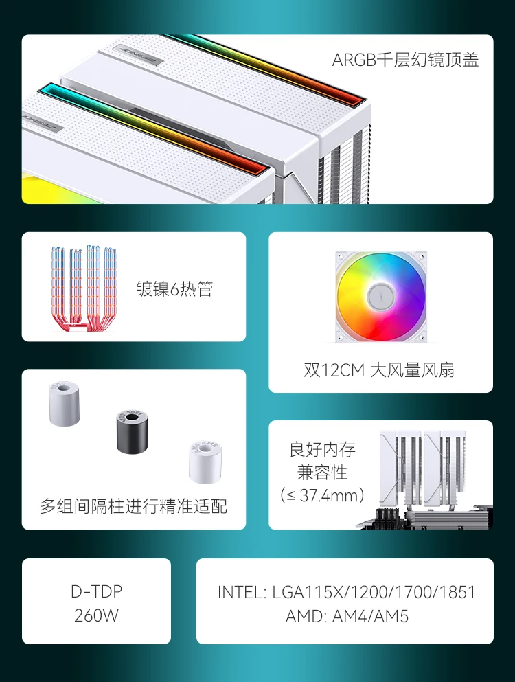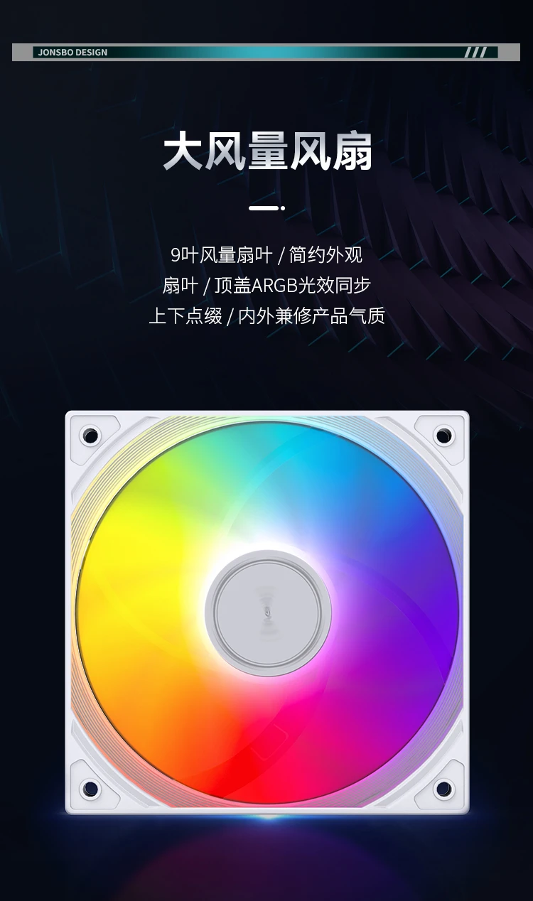 全新CB80大雪系列为乔思伯设计第三代6热管12CM双塔散热器,顶盖设计经典圆形孔整齐排列,镶嵌金属质感铭牌辅以偏置长条形千层幻境点缀,勾勒出简洁和恰到好处立体光效意境,全新调教优化热管和风扇参数,在扣具等细节也进行精准适配,通过多重细节优化给此系列散热器带来了出色的散热效能。