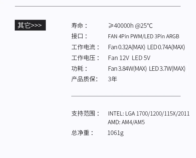 接口:FAN 4Pin PWM / LED 3Pin ARGB