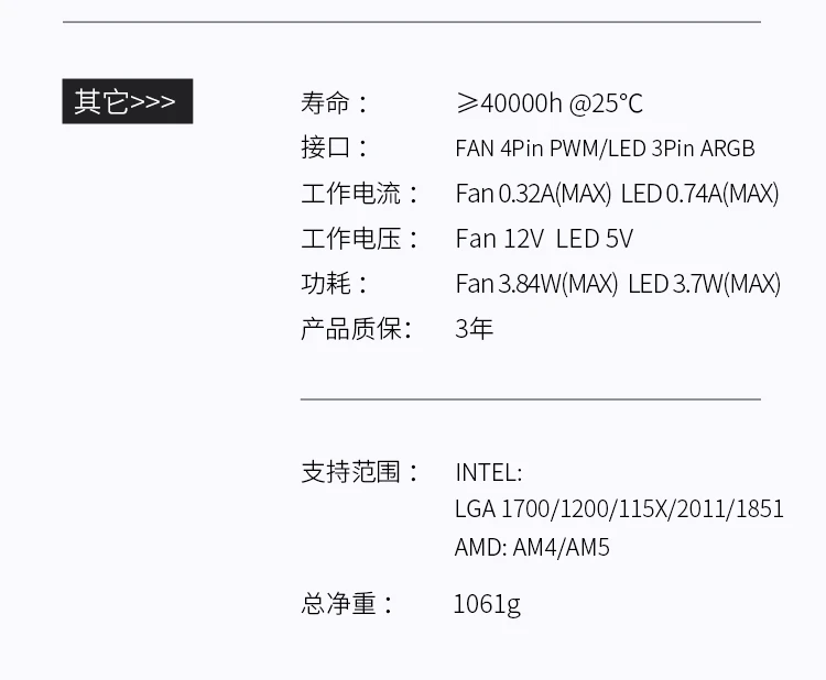 接口:FAN 4Pin PWM / LED 3Pin ARGB