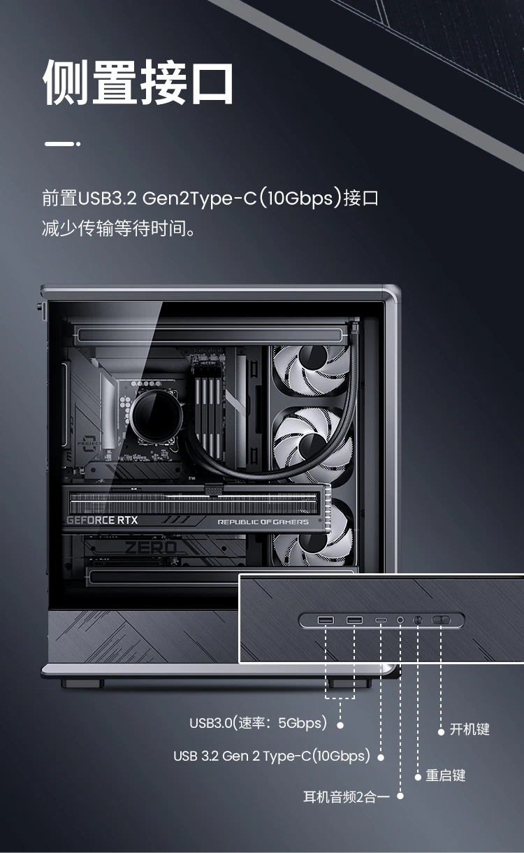 侧置接口:USB3.2 Gen2 Type-C*1/USB3.0*2/AUDIO*1+MIC*1(2合1) |