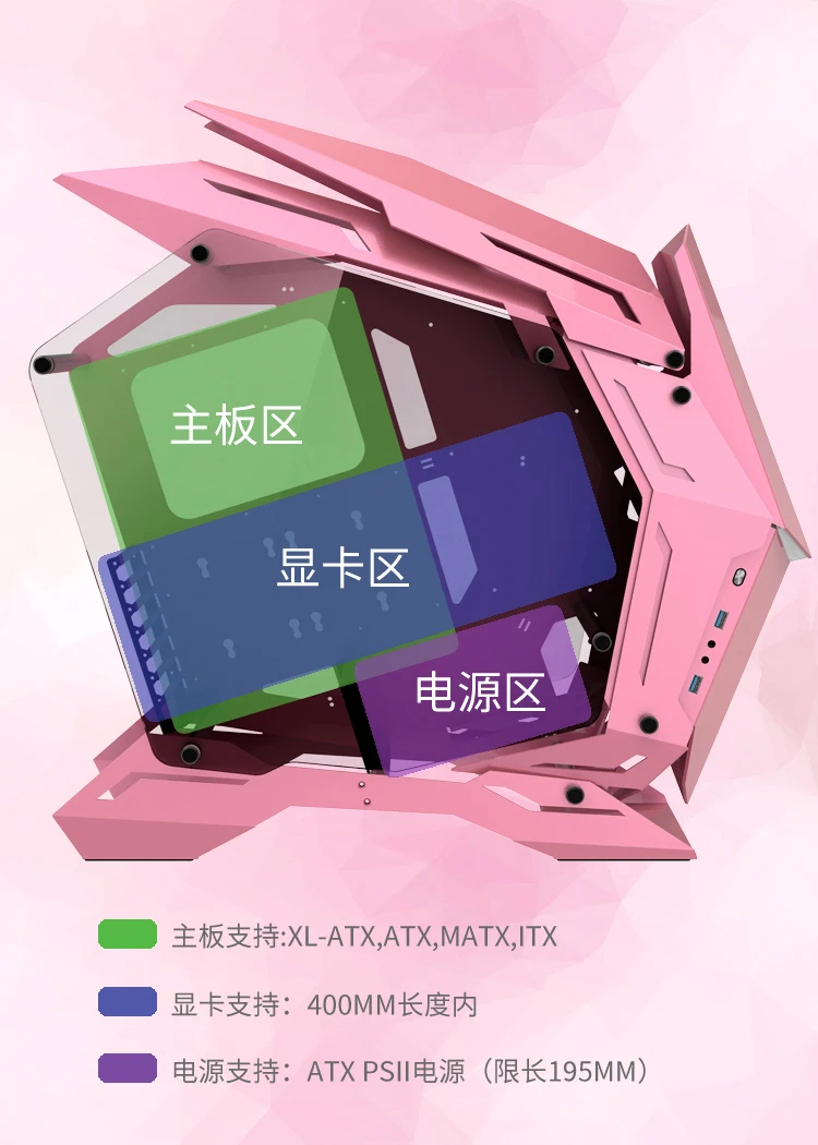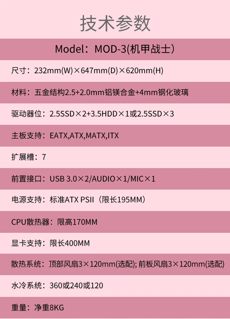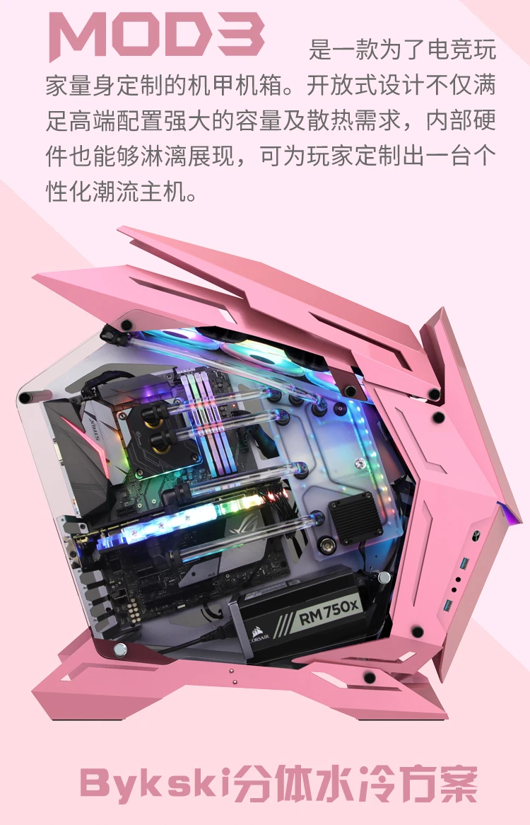 MOD3是一款为了电竞玩家量身定制的机甲机箱。开放式设计不仅满足高端配置强大的容量及散热需求,内部硬件也能够淋漓展现,可为玩家定制出一台个性化潮流主机。