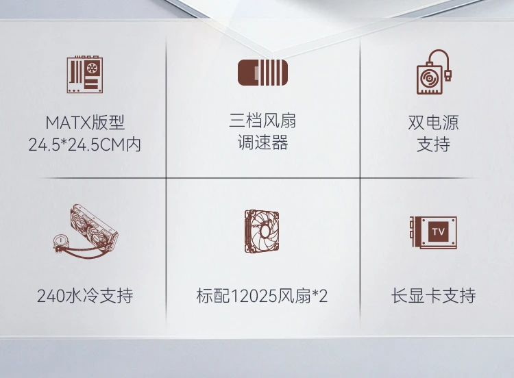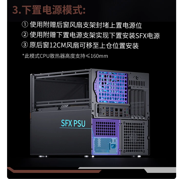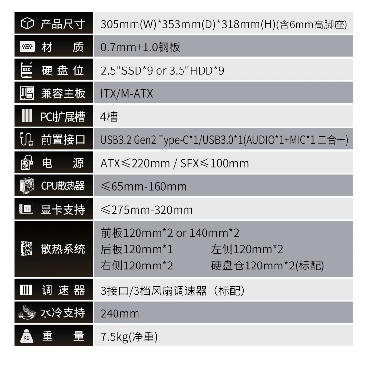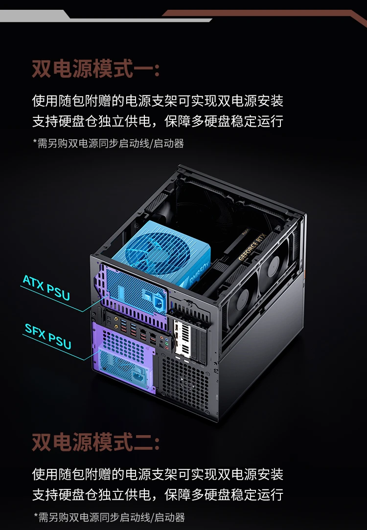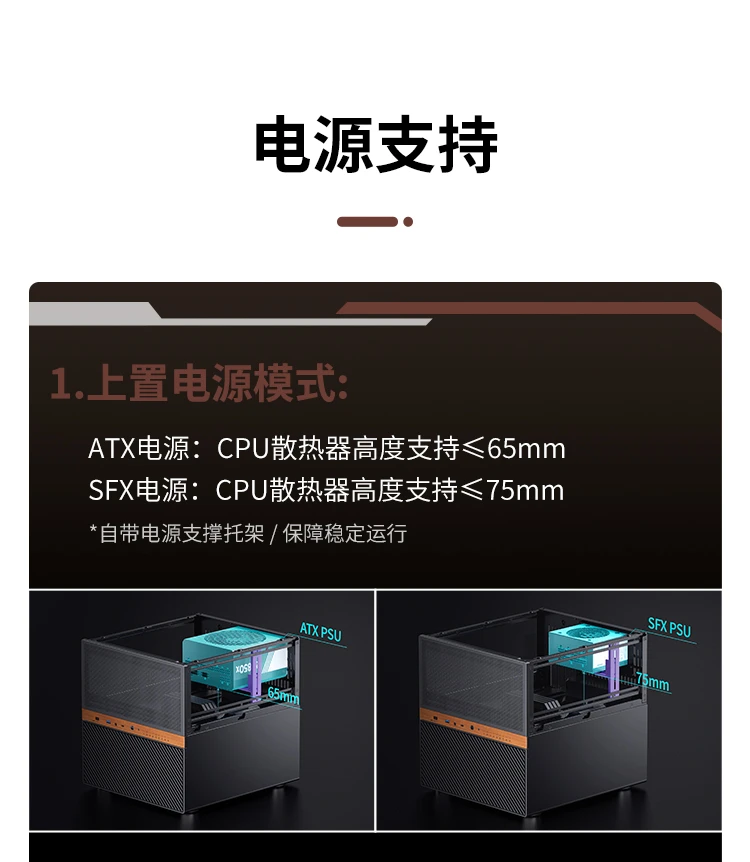 电源:ATX≤220mm / SFX≤100mm(支持双电源模式) |