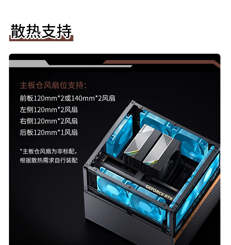 | 散热系统:前板120mm*2或140mm*2 / 后板120mm*1 / 左侧120mm*2 / 右侧120mm*2 / 硬盘仓120mm*2(标配) |