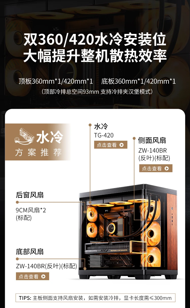| 水冷系统:顶部:360mm*1 / 420mm*1;底板360mm*1 / 420mm*1 |