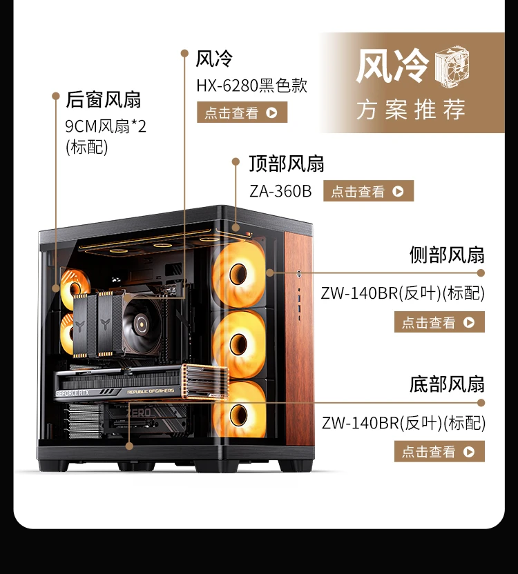 | 风扇:顶部:120mm*3/140mm*3(非标配); 底部:140mm*3(标配) / 120mm*3(非标配) ; 右侧:140mm*3(标配) / 120mm*3(非标配) ; 背板:92mm*2(标配) |