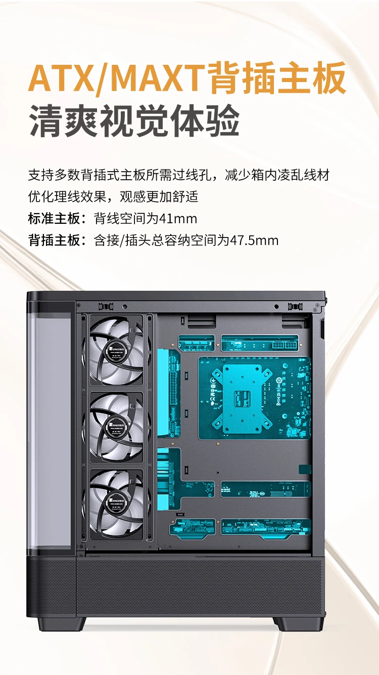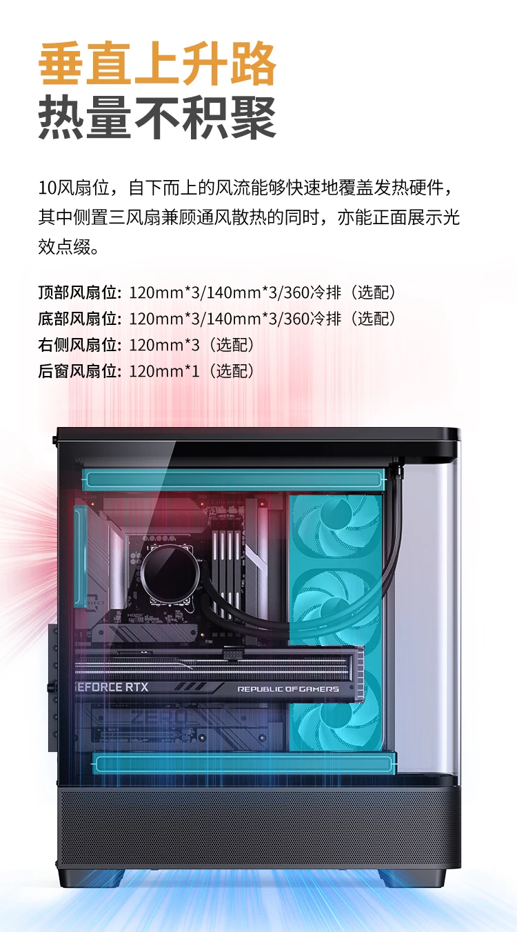 | 风扇:顶部:120mm*3/140mm*3(非标配);底部:120mm*3 / 140mm*3(非标配) 右侧:120mm*3(非标配) 背板:120mm*1(非标配) |