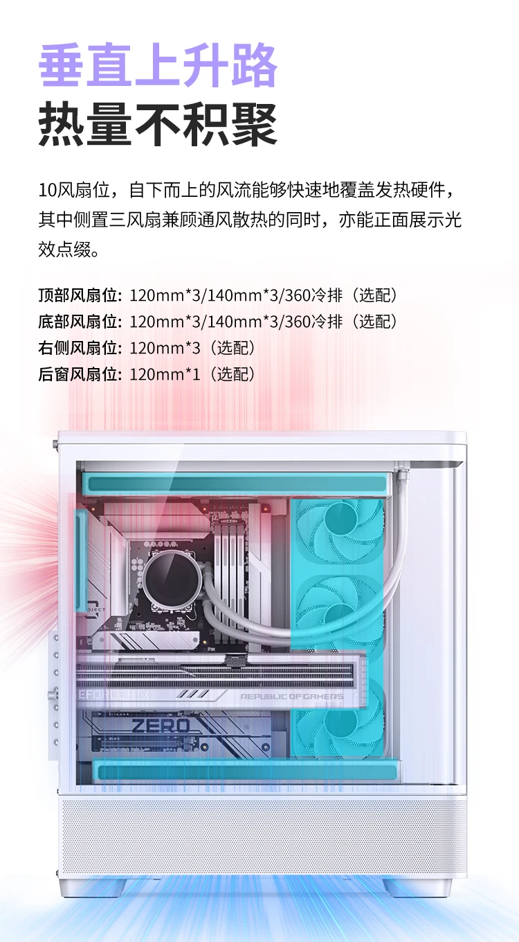| 风扇:顶部:120mm*3/140mm*3(非标配);底部:120mm*3 / 140mm*3(非标配) 右侧:120mm*3(非标配) 背板:120mm*1(非标配) |