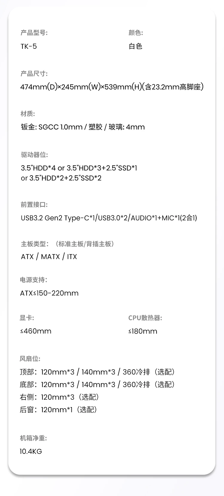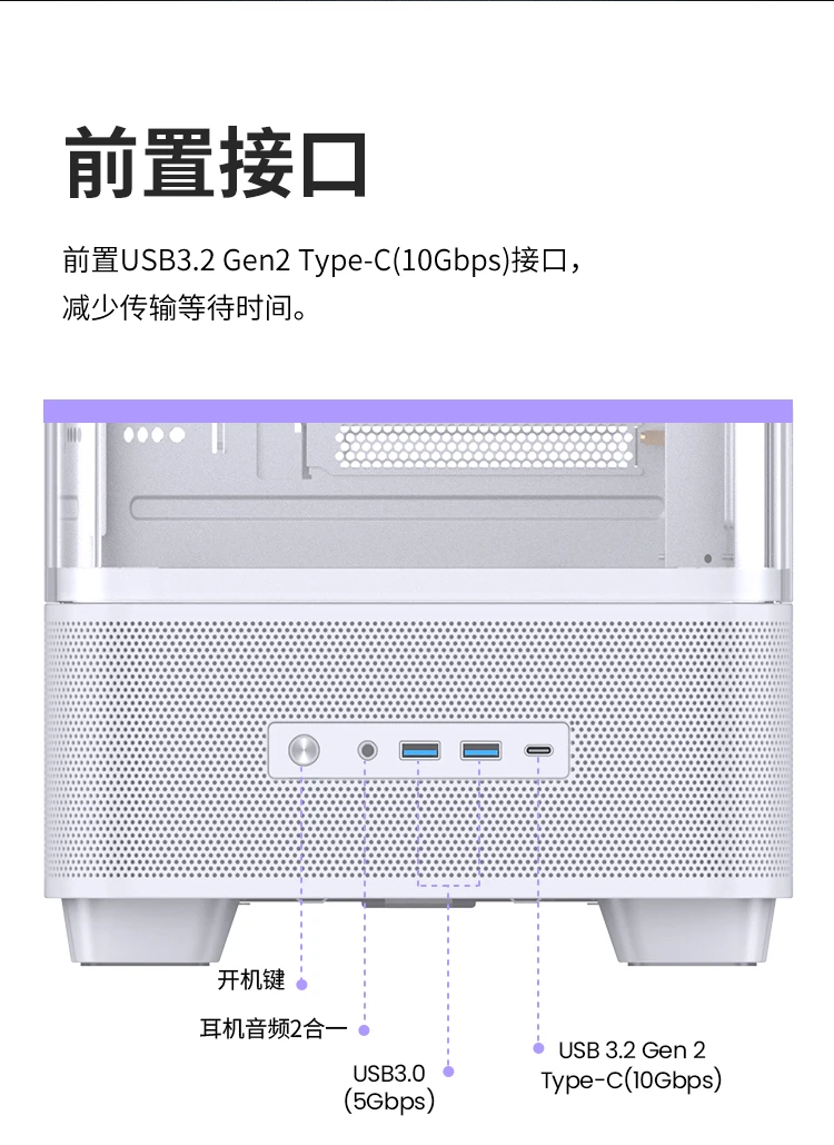 | 前置接口:USB3.2 Gen2 Type-C*1/USB3.0*2/AUDIO*1+MIC*1(2合1) |