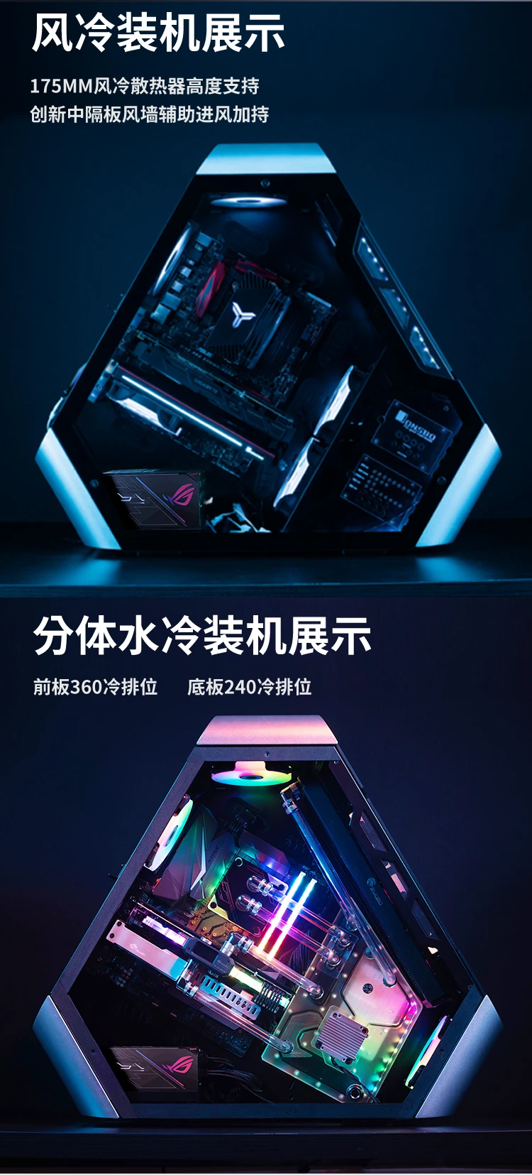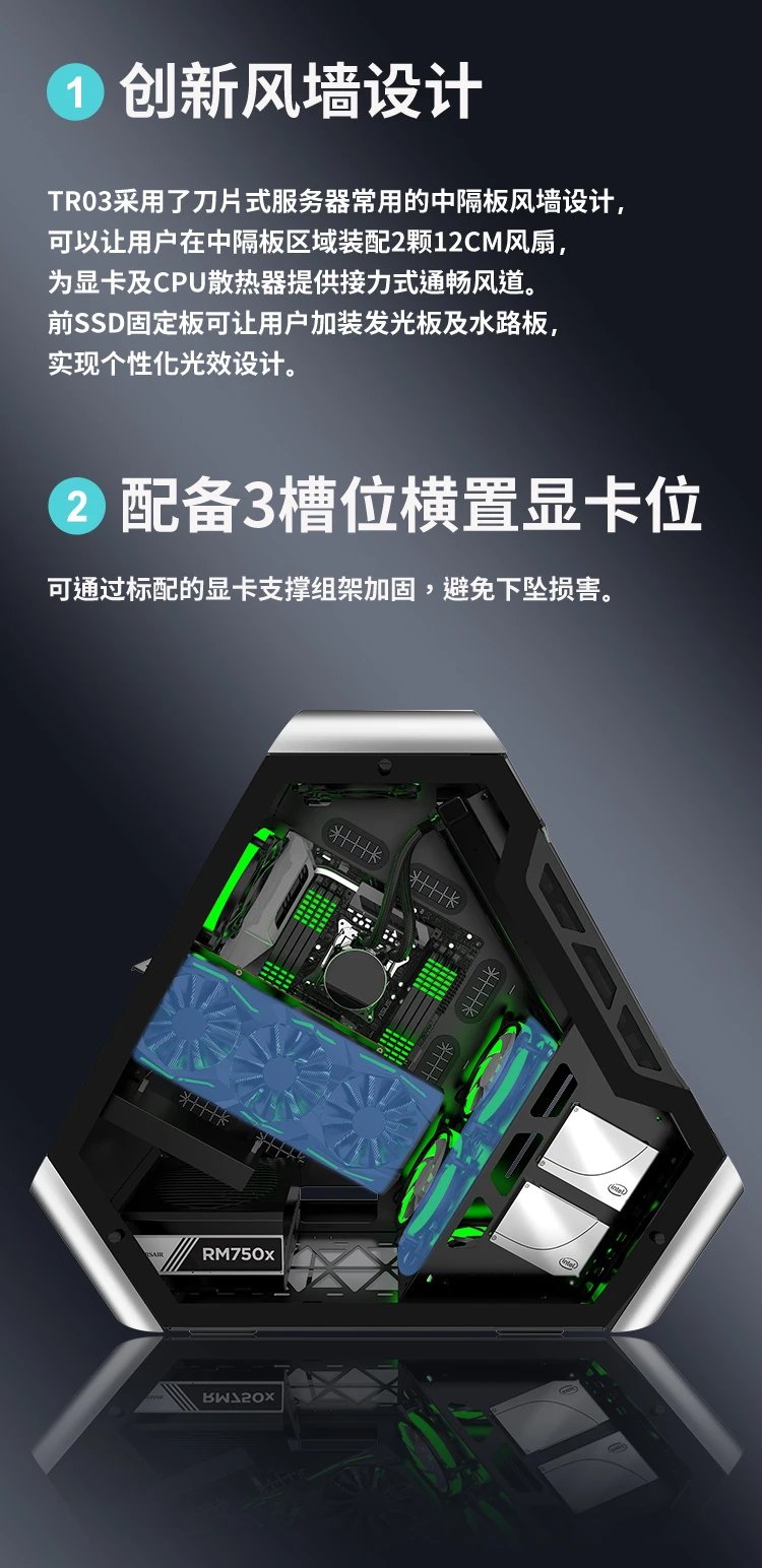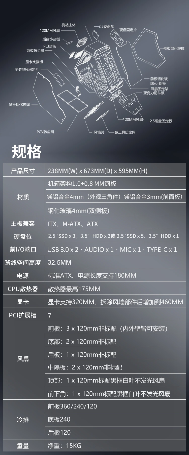 风扇:前板:3*120mm非标配(内外壁皆可安装);底部:2*120mm非标配;后板:1*120mm非标配;中隔板:2*120mm非标配;