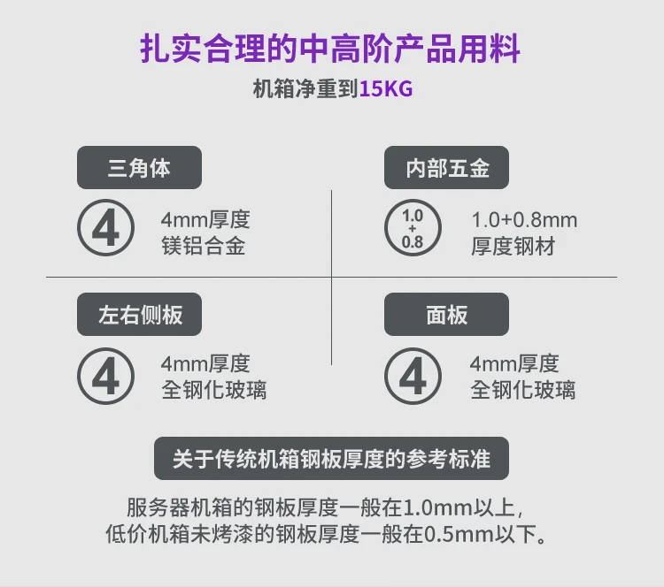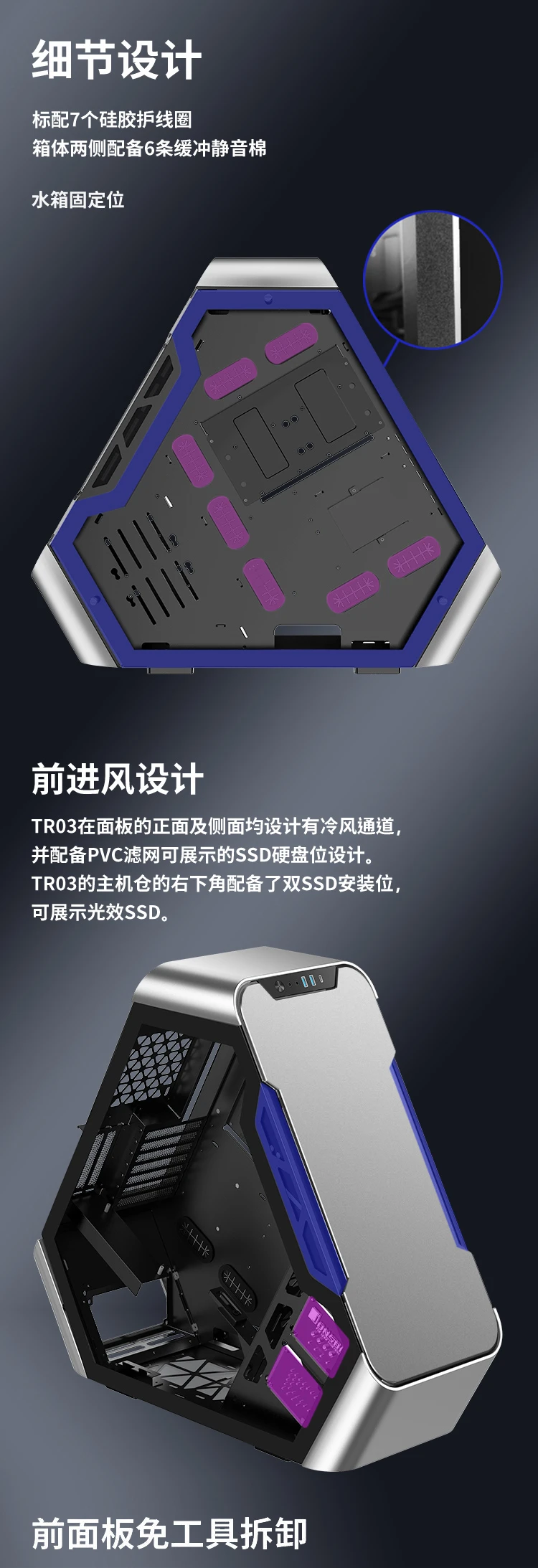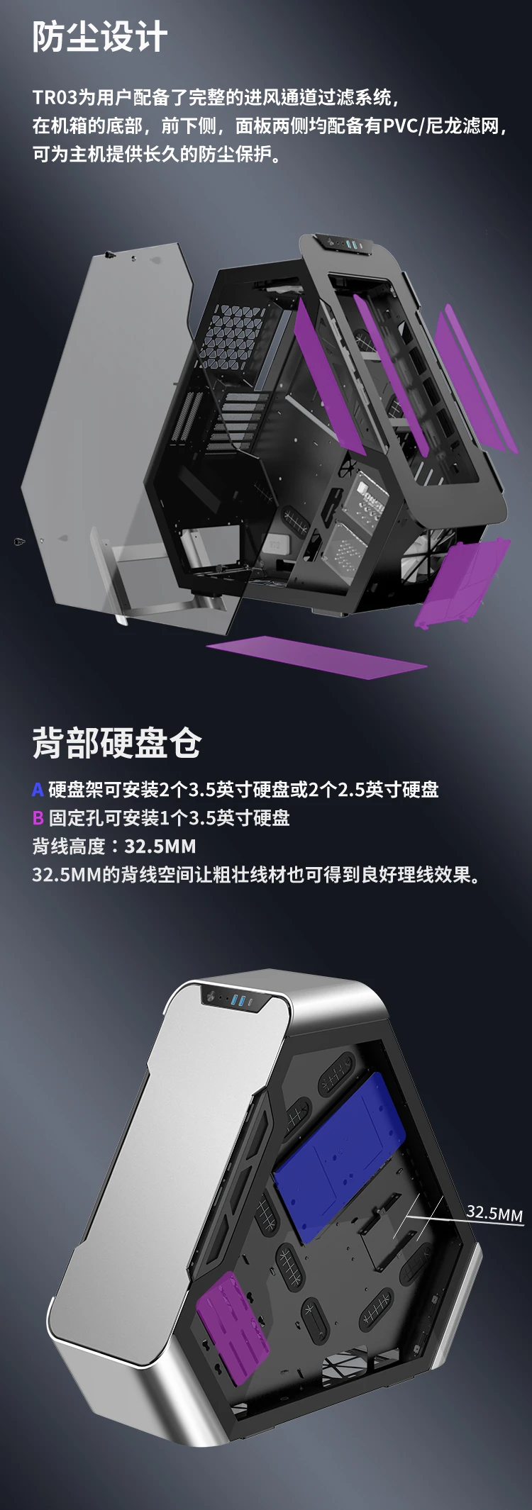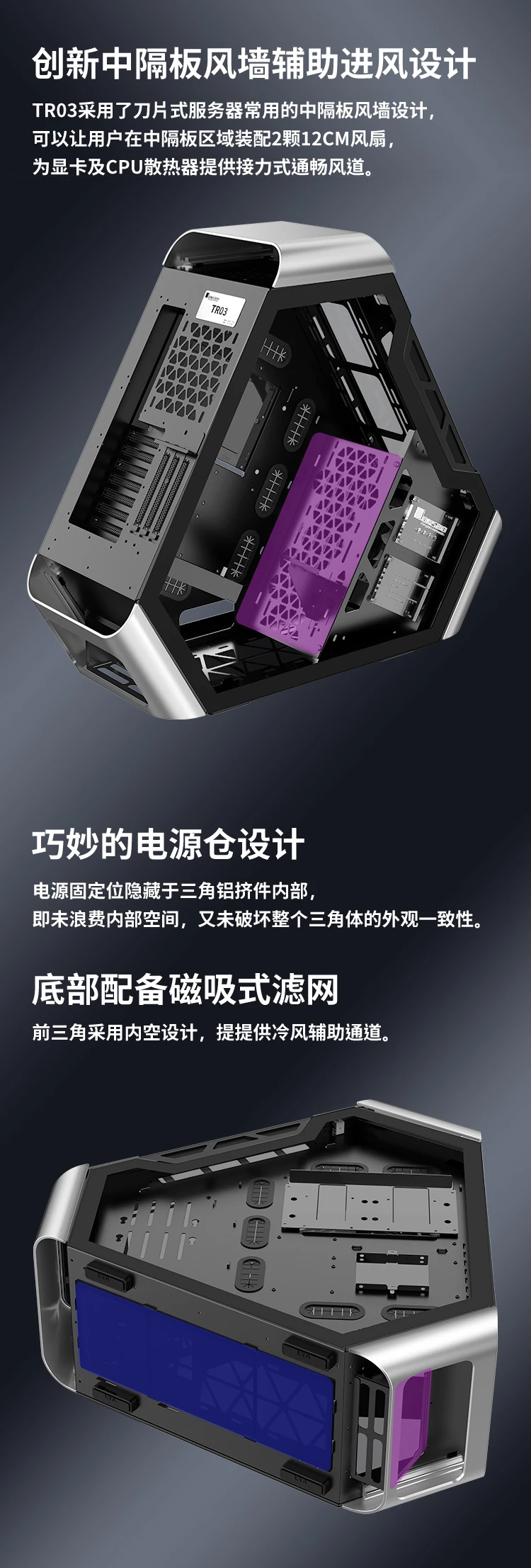 风扇:前板:3*120mm非标配(内外壁皆可安装);底部:2*120mm非标配;后板:1*120mm非标配;中隔板:2*120mm非标配;