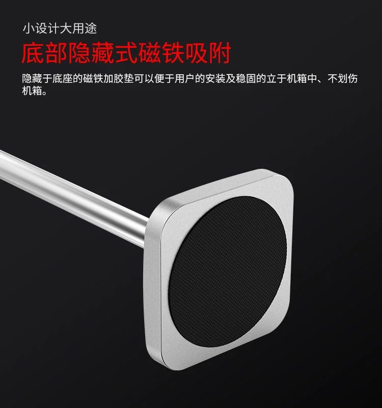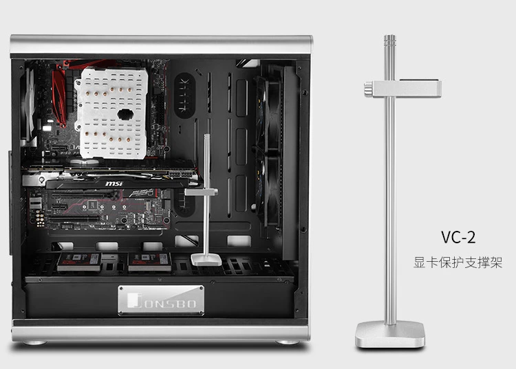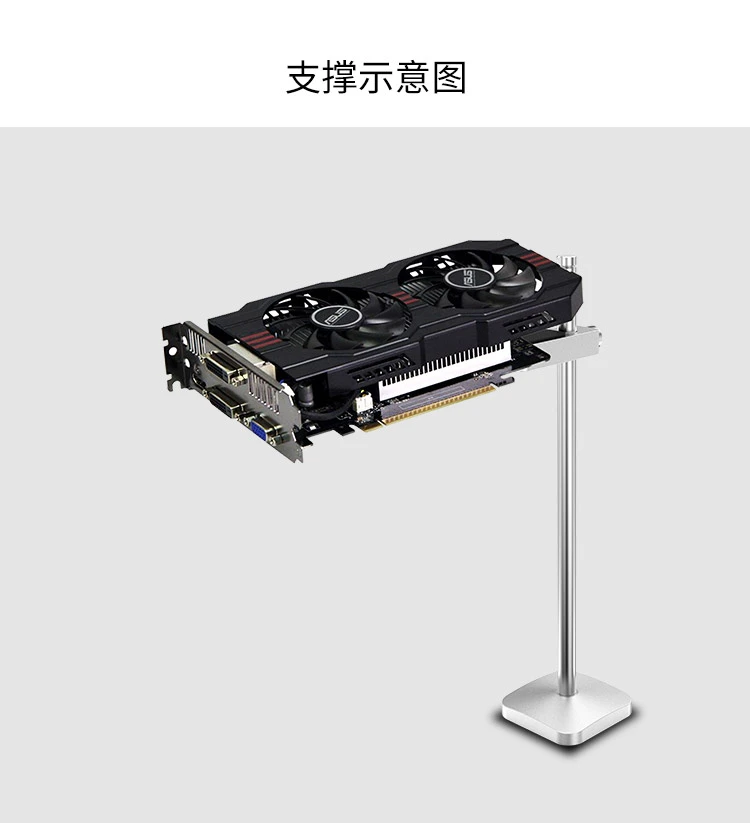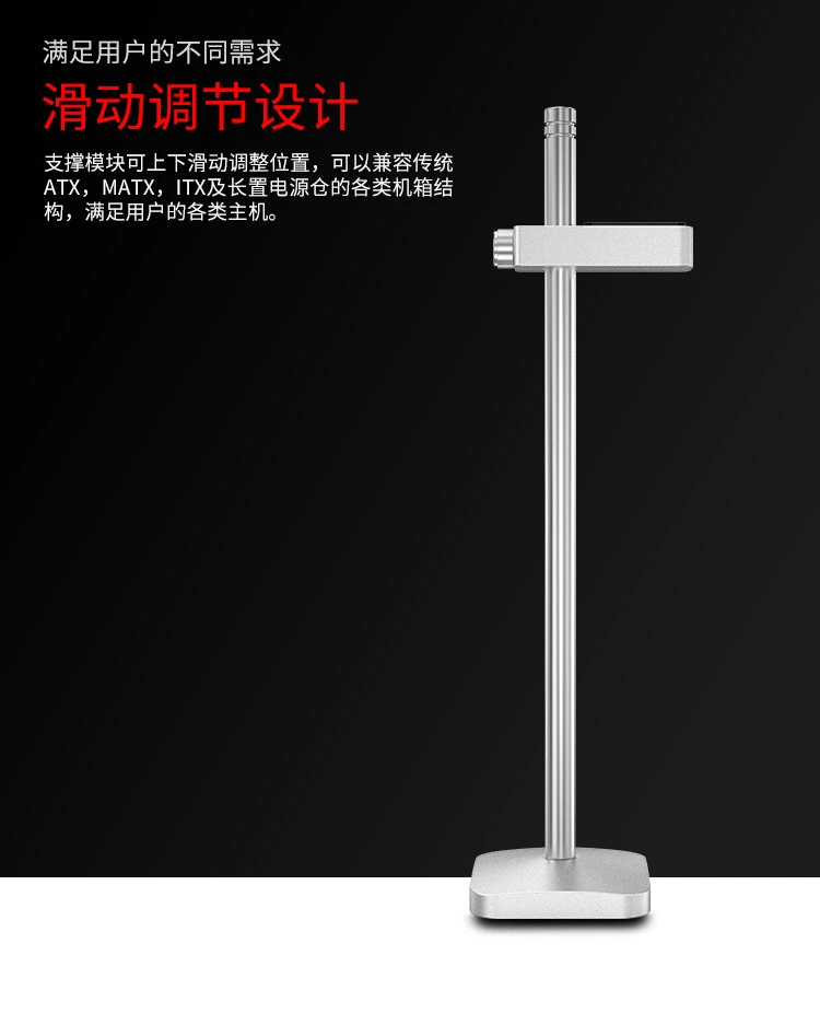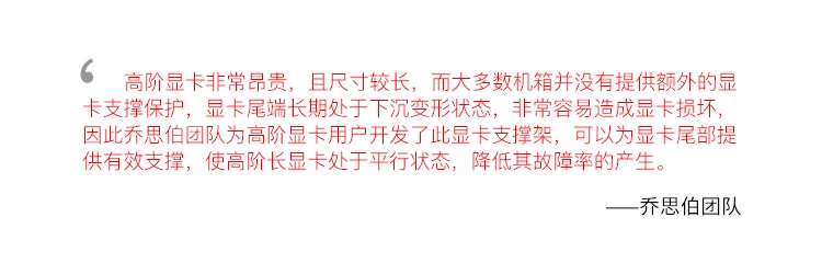 高阶显卡非常昂贵,且尺寸较长,而大多数机箱并没有提供额外的显卡支撑保护,显卡尾端长期处于下沉变形状态,非常容易造成显卡损坏,因此乔思伯团队为高阶显卡用户开发了此显卡支撑架,可以为显卡尾部提供有效支撑,使高阶长显卡处于平行状态,降低其故障率的产生。