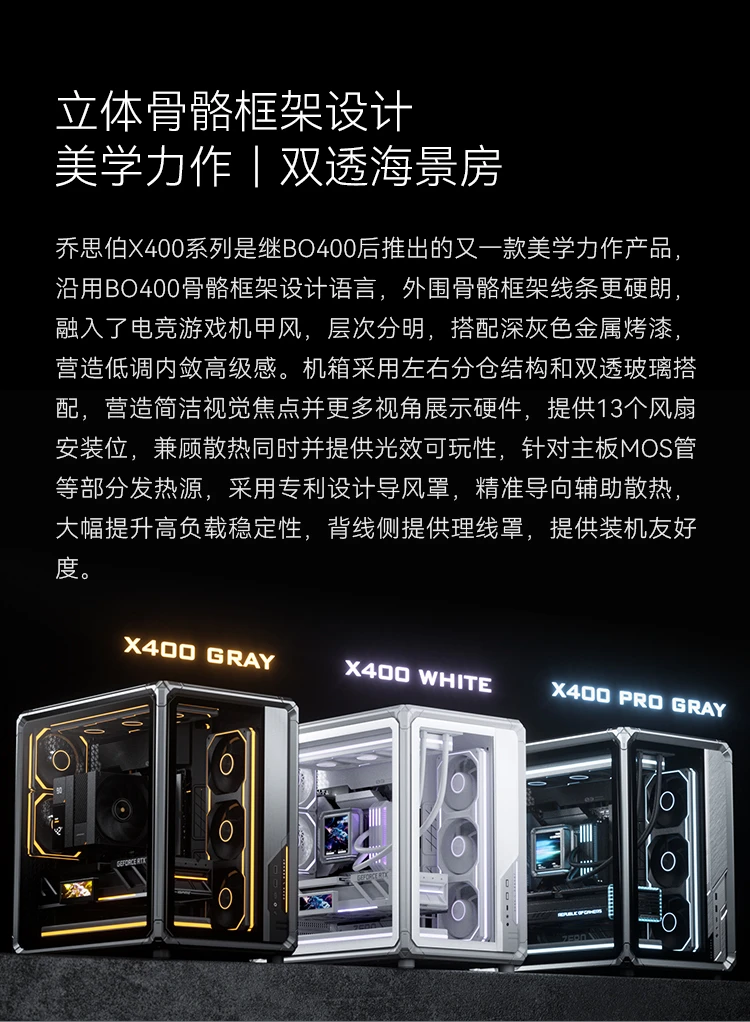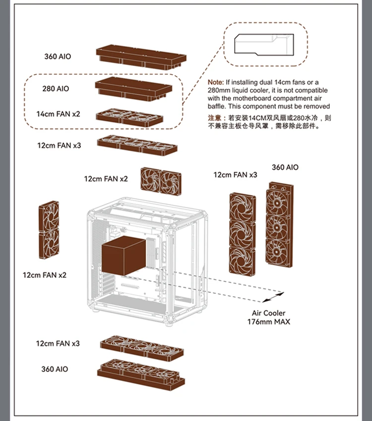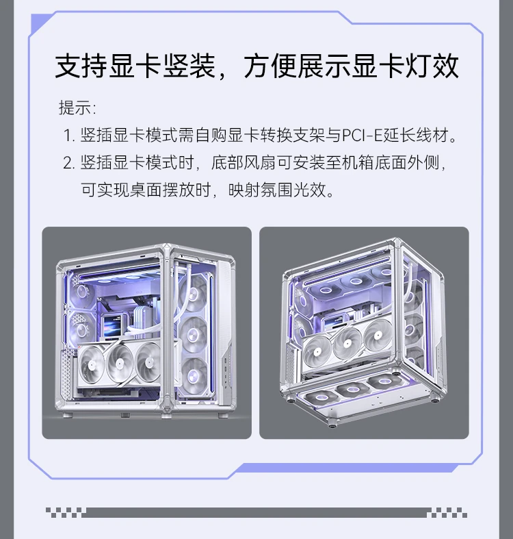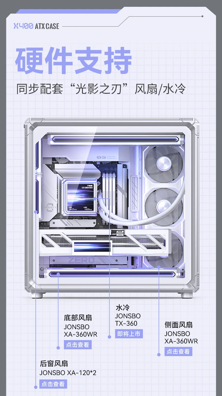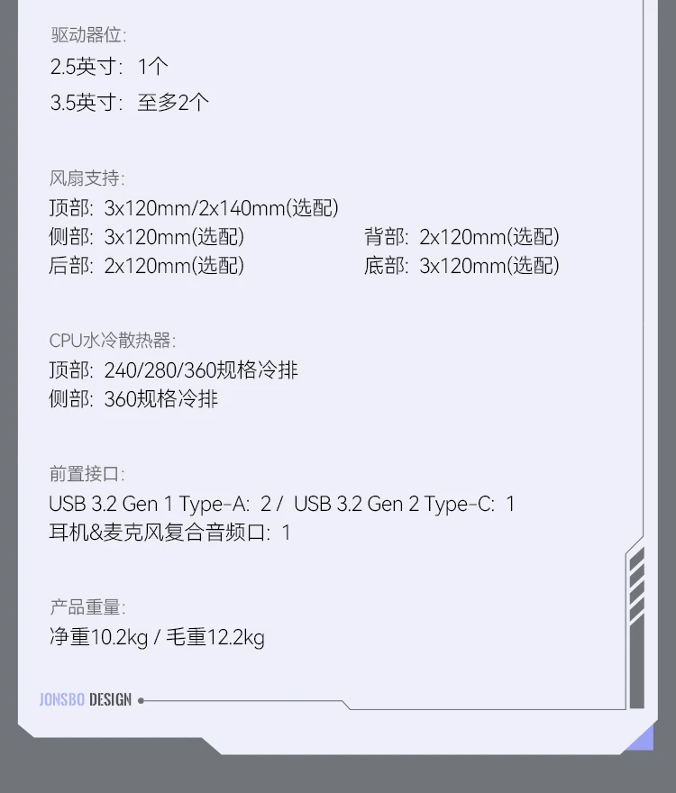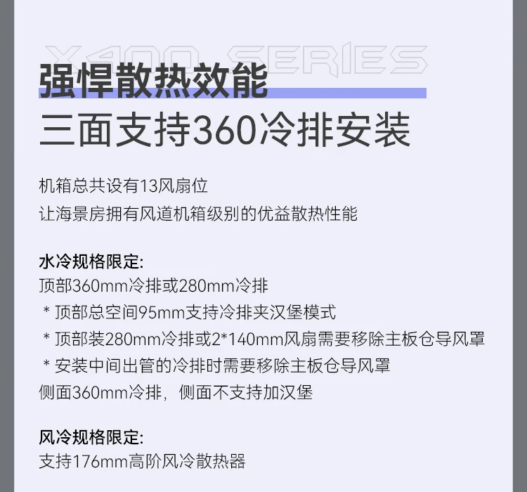 水冷支持:顶部240mm/280mm/360mm规格冷排;侧部:360mm规格冷排 |