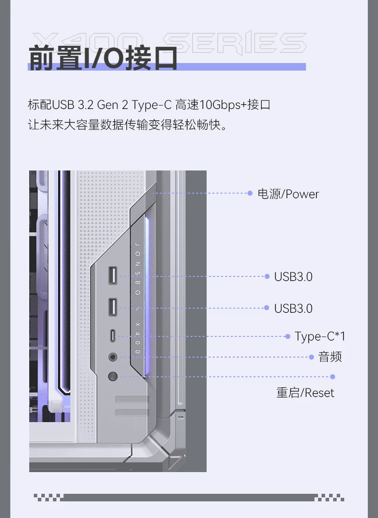 前置接口:USB3.2 Gen1 Type-A*2 / USB3.2 Gen 2 Type-C*1 / AUDIO*1 & MIC*1 |