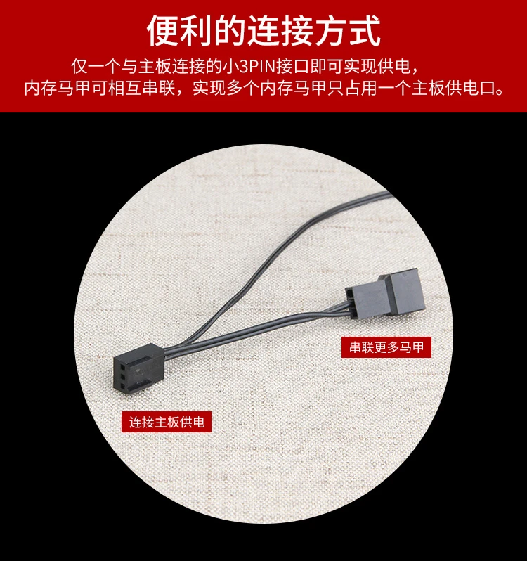 NC-1是一款可以装配在普通电脑内存上实现七彩光效的内存马甲,可以让用户以更低费用实现内存发光尤其是不用淘汰现有的不发光内存条。马甲顶部可实现流光256色自动变化功能,双侧板采用铝镁合金材质,阳极拉丝工艺制作;内部配备双导热硅脂片,可辅助内存散热;可支持高/矮内存条和单/双层芯片内存;配备标准小3PIN供电接口,接口可串联实现多个内存马甲共用一个供电接口。